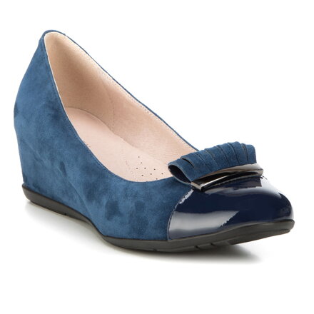 Granatowe czółenka wykonane z połączenia skóry zamszowej i lakierowanej. Nubukowe frędzle szykownie spięte grafitowym elementem zdobią lakierowany nosek z połyskiem. Wnętrze buta wyścielone profilowaną, skórzaną wkładką zapewnia wysoki komfort użytkowania. Model sprawdzi się do smart casualowych stylizacji zarówno do tych na czas wolny od pracy, jak i tych służbowych. Damskie czółenka zamszowe z ozdobnie spiętymi frędzlami to stylowy dodatek na wiele okazji.