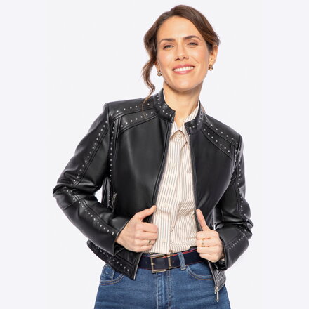 Ta kurtka to must-have w szafie każdej kobiety, która ceni połączenie klasyki z wyrazistym stylem. Wykonana z ekoskóry, łączy nowoczesność z elegancją, a metalowe detale – logo producenta na boku i suwakach – nadają jej unikalny charakter. Błyszczące nity na rękawach, kołnierzu i brzegach stanowią odważny akcent, który wyróżnia ją na tle innych. Zamek błyskawiczny, klasyczna stójka i dwie kieszenie na zamek zapewniają komfort i funkcjonalność w każdej sytuacji.