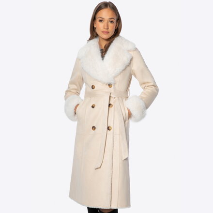Dwurzędowy damski płaszcz z futrzanym kołnierzem kremowy 101-9W-001-0 Čítajte viac